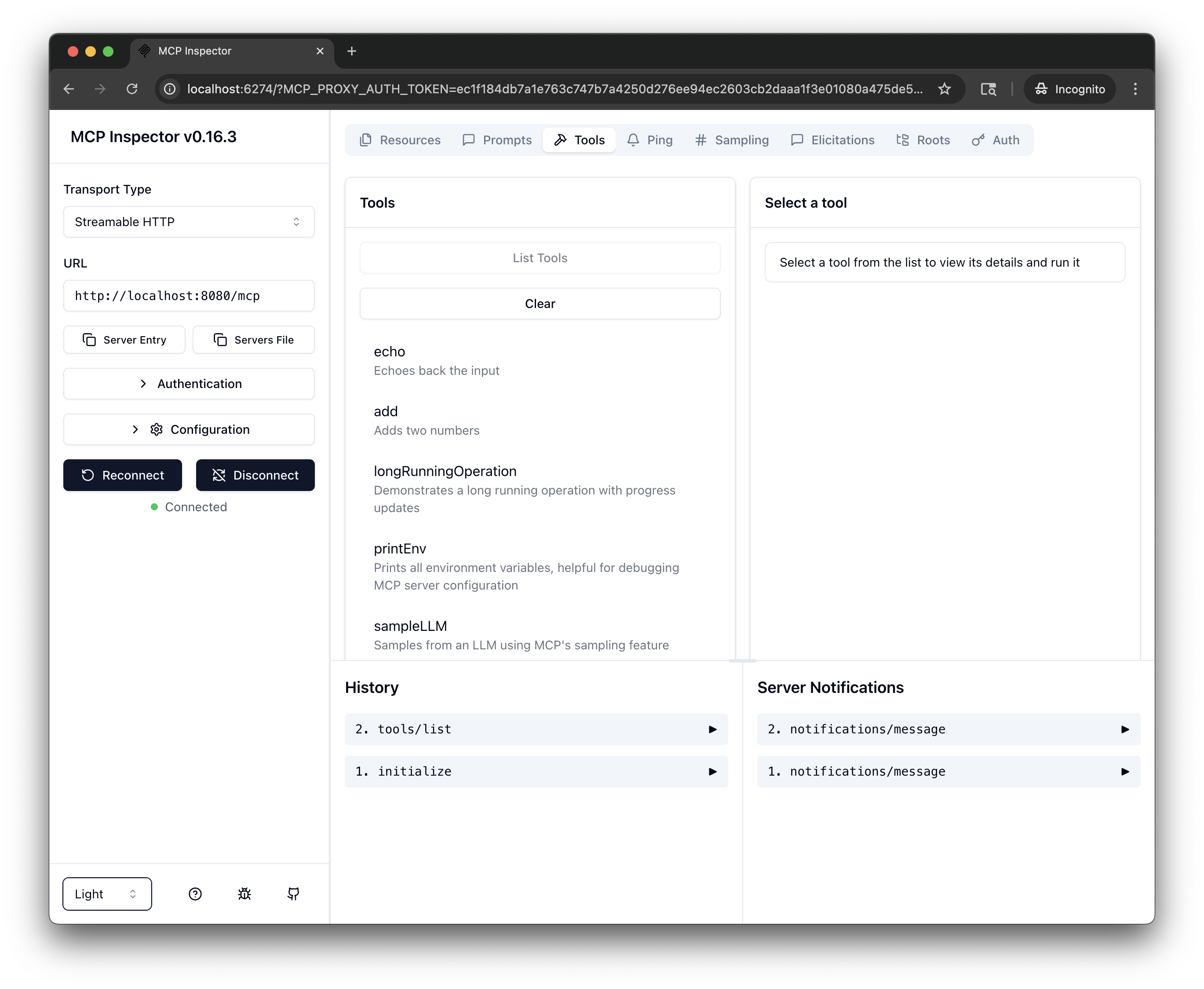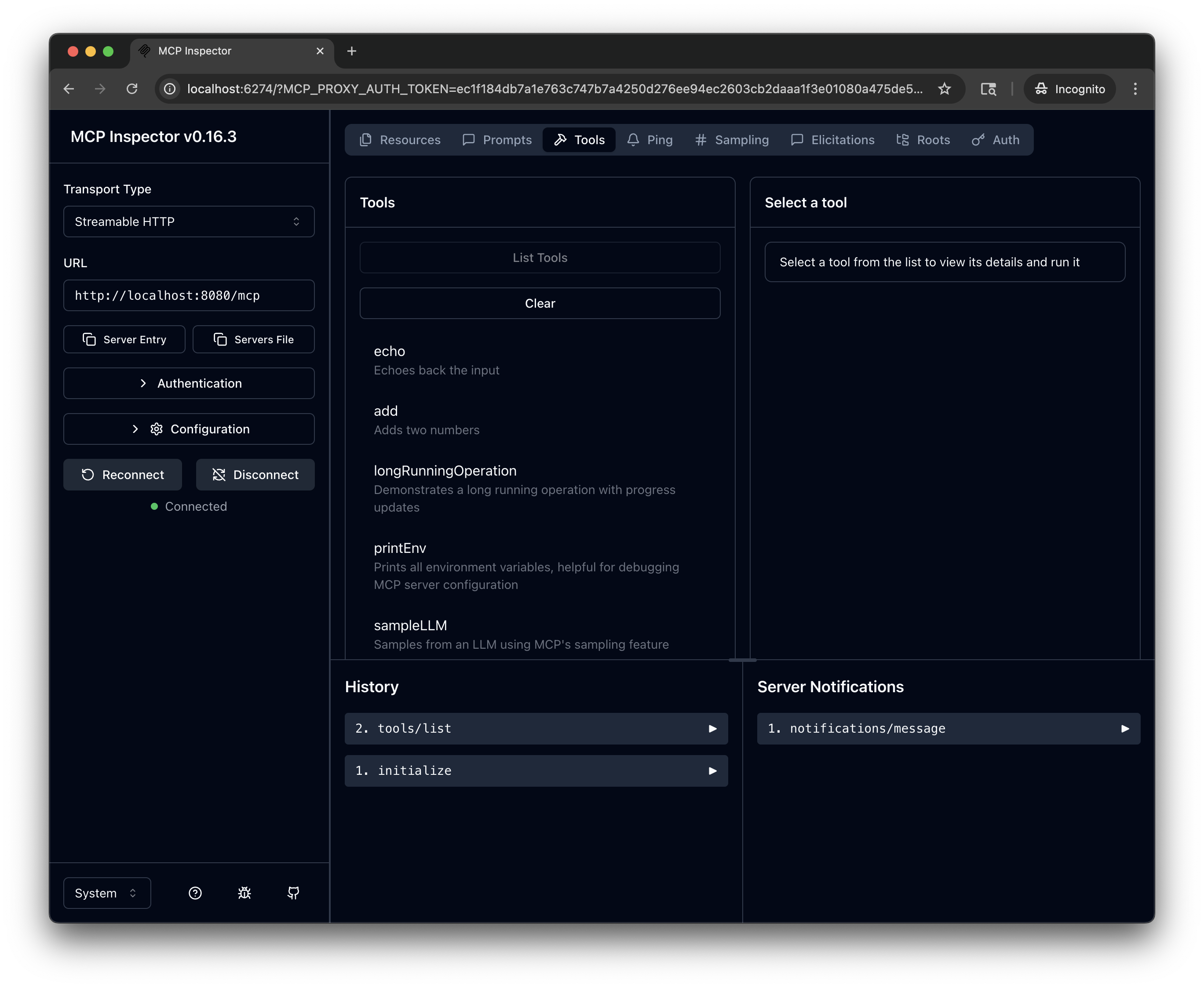 2. From the terminal, install the MCP Inspector tool. Then, the MCP Inspector opens in your browser. If the MCP inspector tool does not open automatically, run mcp-inspector.