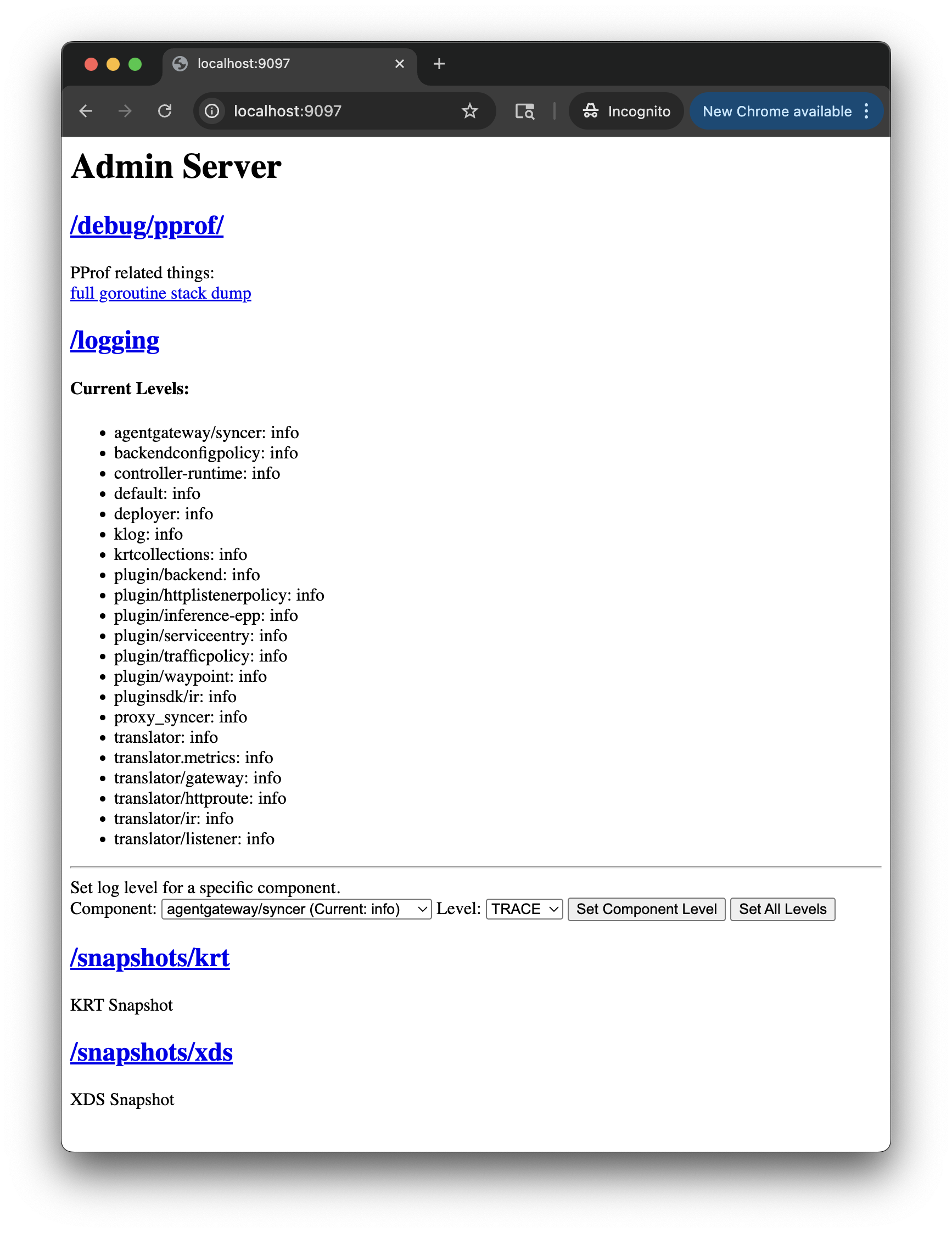 /logging Review the current logging levels of each component in the control plane. You can also interactively set the log level by component, such as to enable DEBUG logs.