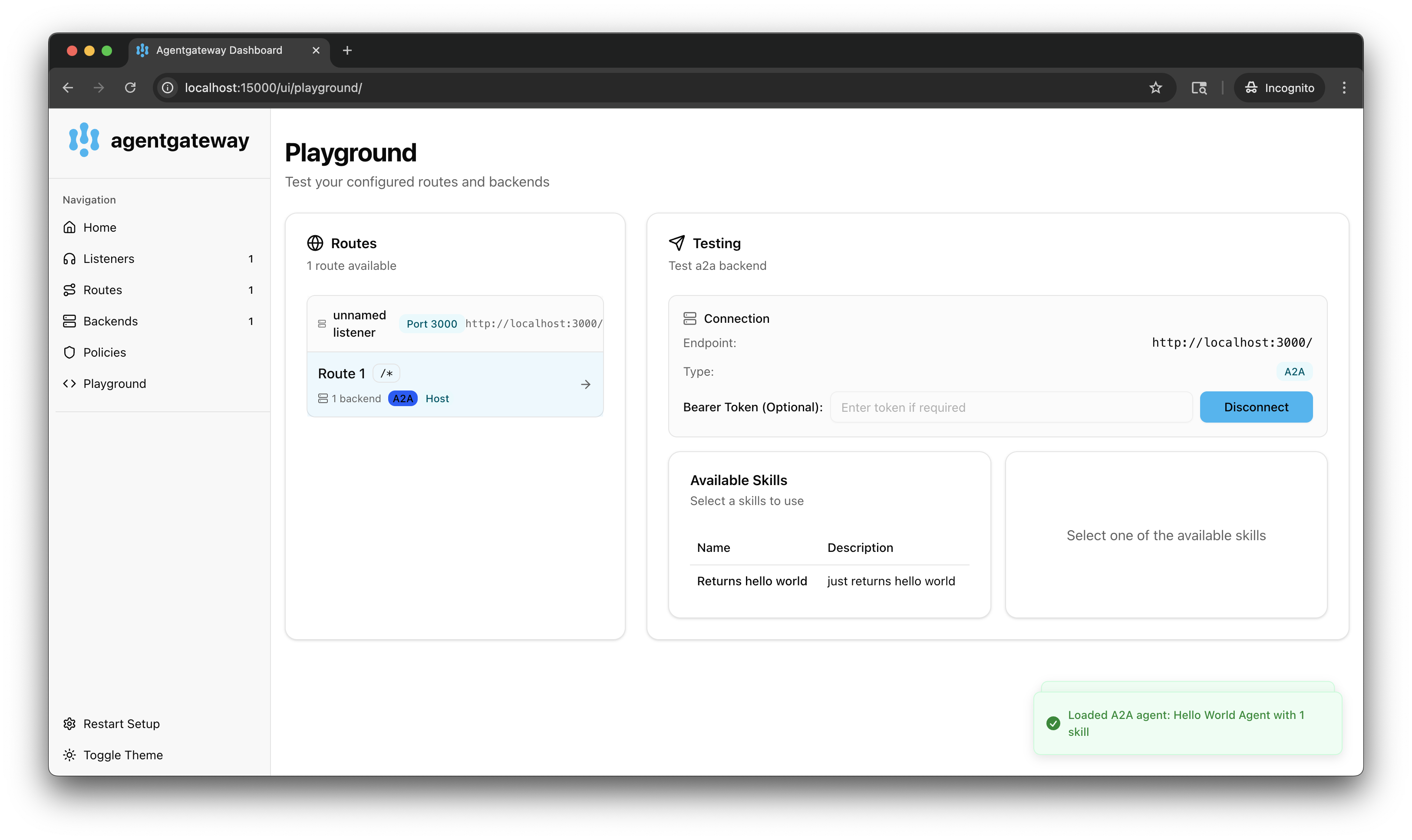 3. In the Connection Settings card, select your listener and the A2A target, and click Connect. The agentgateway UI connects to the A2A target and retrieves all the skills that the target provides.