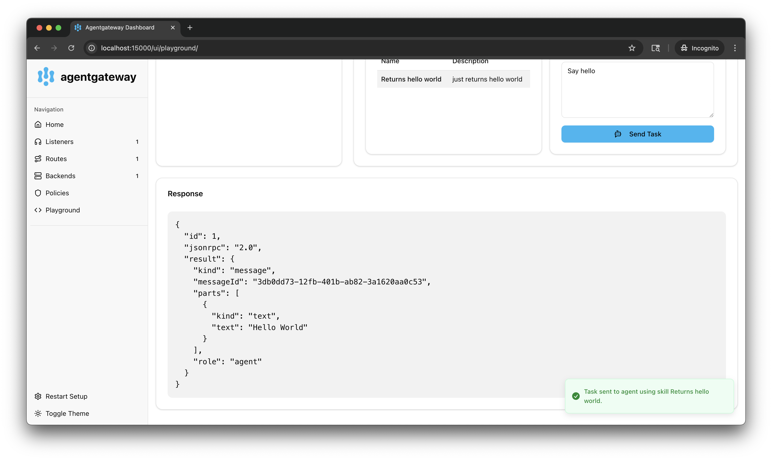3. Select the Returns hello world skill. In the Message field, enter a prompt, such as Say hello, and click Send Task.